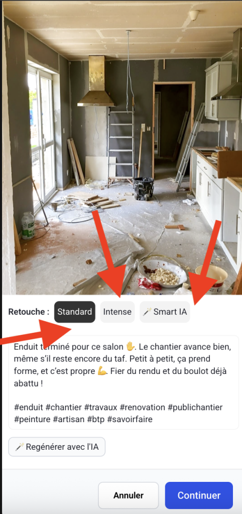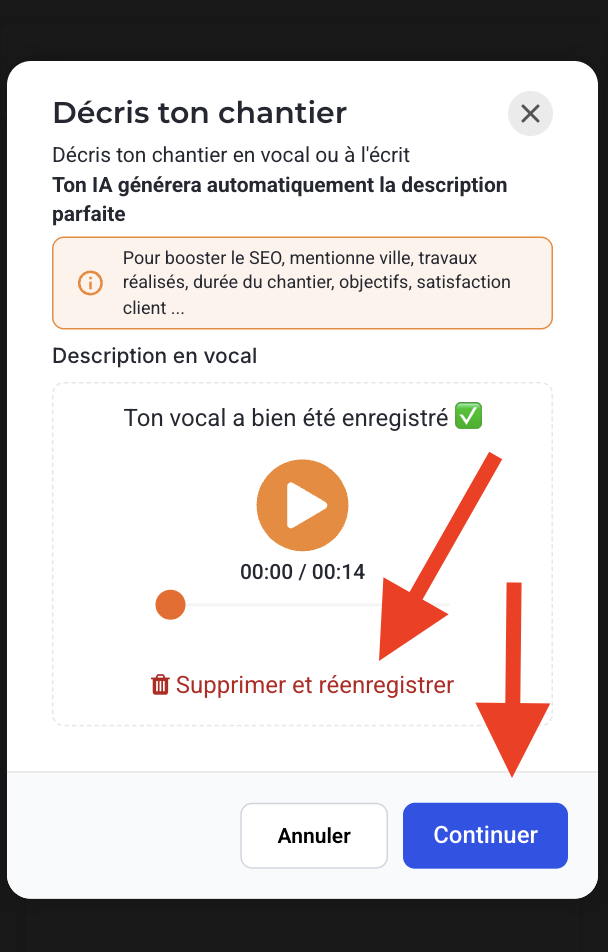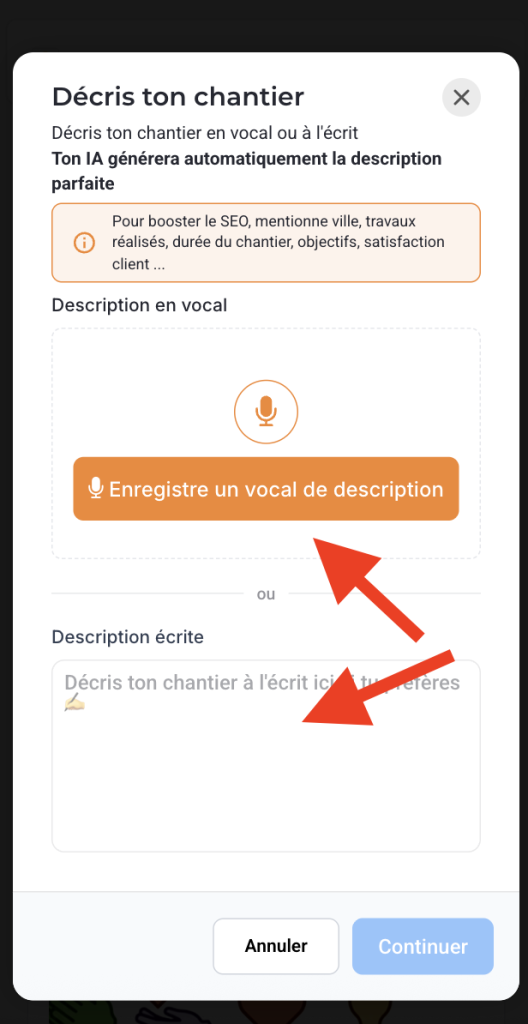 Pour générer une publication à partir d’une description vocale de votre chantier, cliquez sur “Enregistre un vocal de description”. Ensuite, décrivez votre chantier (plus vous donnez de détail, mieux c’est pour nourrir votre intelligence artificielle). Donc n’hésitez pas à donner des détails sur la ville d’intervention, sur les travaux réalisés, sur les marques de produits utilisés, sur l’objectif, sur la réaction du client etc…