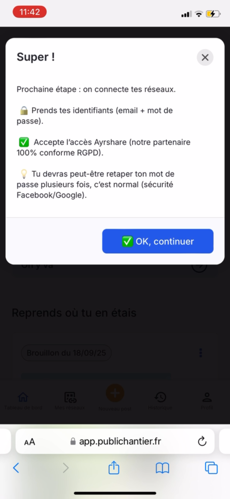 Pour connecter tous vos réseaux à l’application, cliquez sur “Ok, continuer”