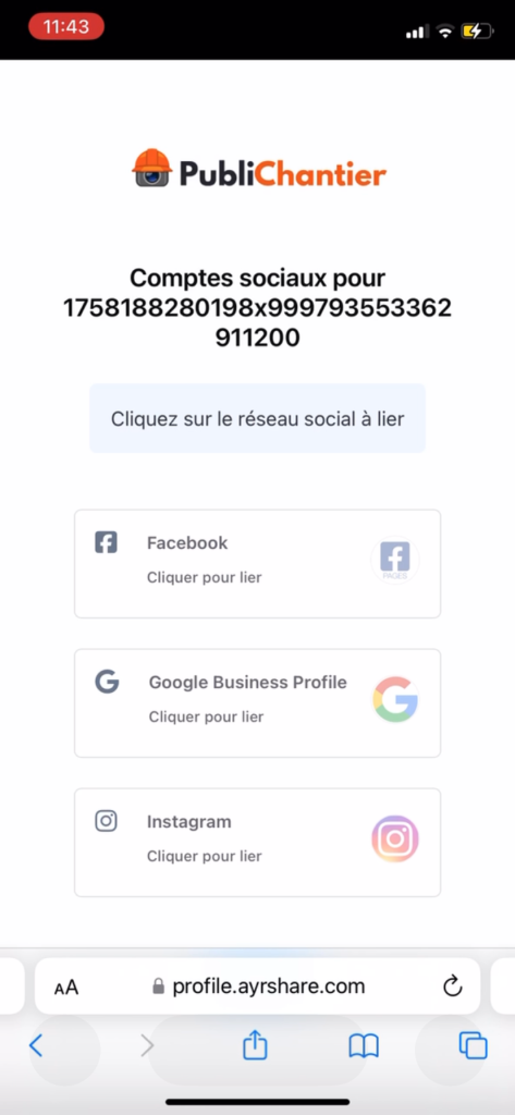 Pour pouvoir publier en 1 clic sur tous vos réseaux, il va falloir connecter notre plateforme à vos réseaux sociaux. Pour cela, vous avez juste à cliquez sur “Cliquer pour lier”. Vous serez ramener vers une page pour vous connecter à votre réseau social (ex: Facebook). Vous n’avez plus qu’à suivre la procédure sur Facebook et valider la connexion.
